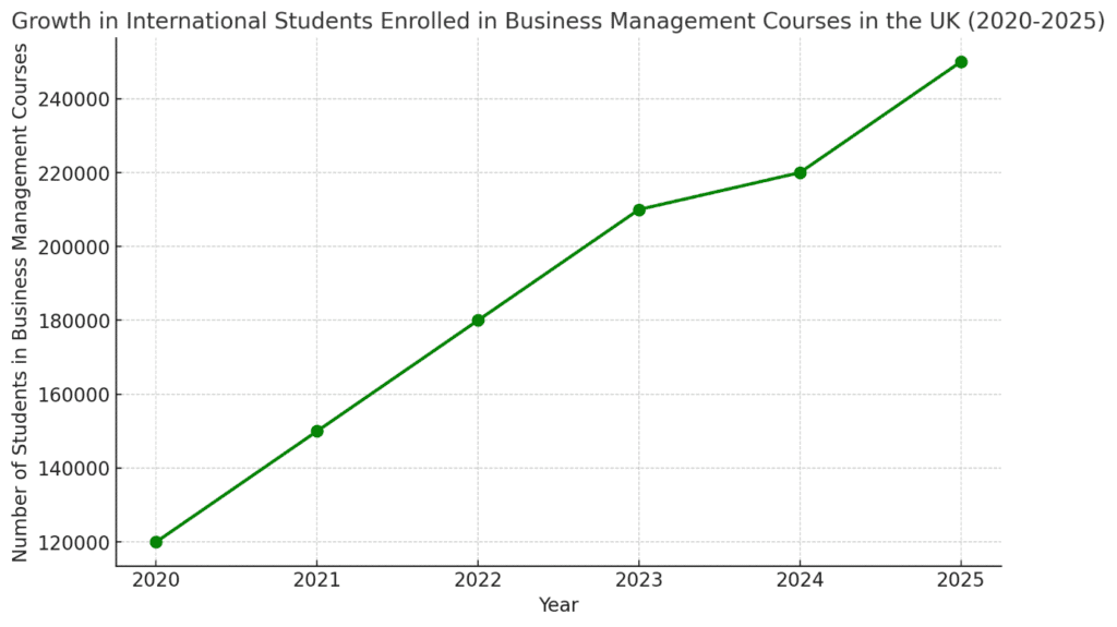 This is the line graph representing the growth in international students enrolled in business management and related courses in the UK from 2020 to 2025. The data shows a steady increase in student numbers year over year.
